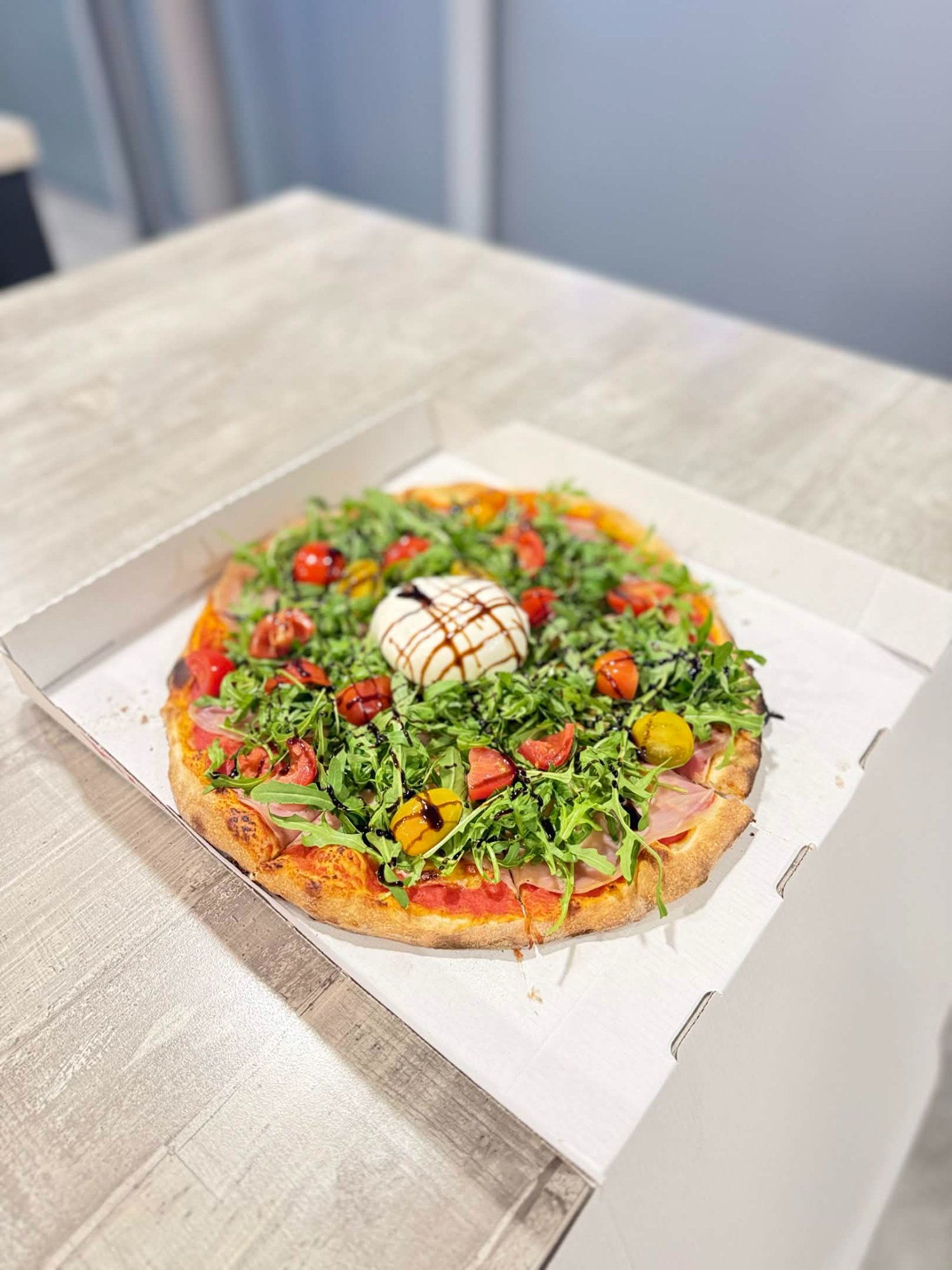 Des ingrédients italiens authentiques — mozzarella fior di latte, jambon de Parme AOP, burrata crémeuse, sauces tomates cuisinées maison — composent chaque pizza avec soin et générosité.